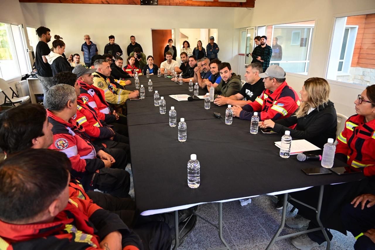 El encuentro tuvo lugar en la Subcentral de Coordinación y Despacho de Brigadistas – Las Golondrinas, y acompañaron al mandatario funcionarios del Gabinete provincial que se encuentran haciendo base en la zona afectada, entre ellos el ministro de Seguridad y Justicia, Héctor Iturrioz; la ministra de Desarrollo Humano, Florencia Papaiani; el ministro de Turismo, Diego Lapenna; el ministro de Producción, Juan Pavón; el secretario de Bosques, Abel Nievas; el secretario de Infraestructura, Hernán Tórtola; el subsecretario de Protección Civil, Eduardo “Lalo” Pérez; los intendentes de Epuyén, José Contreras, y de El Hoyo, César Salamín; el presidente de Chubut Deportes, Milton Reyes; brigadistas nacionales, de Chubut y de otras provincias.