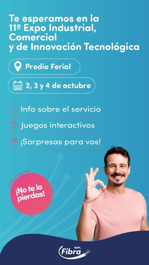 Los días 2, 3 y 4 de octubre, nuestra Cooperativa participará de la nueva edición de la Expo Industrial con un stand innovador de SCPL Fibra, donde presentará las últimas novedades de su servicio de telefonía e internet por fibra óptica y el plan de expansión de la red en la ciudad con precios promocionales.