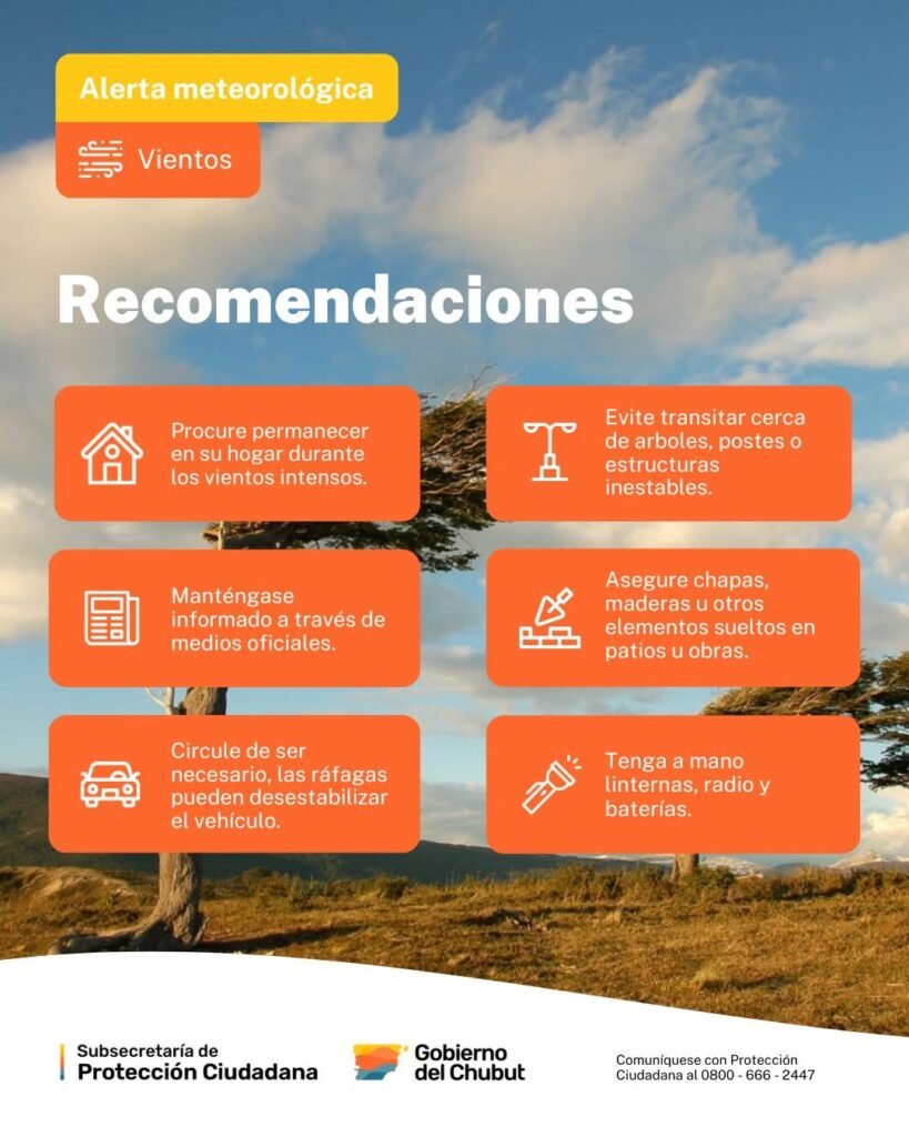 Desde la Subsecretaría de Protección Ciudadana del Gobierno del Chubut, compartimos recomendaciones ante los alertas por vientos fuertes emitidos por el Servicio Meteorológico Nacional