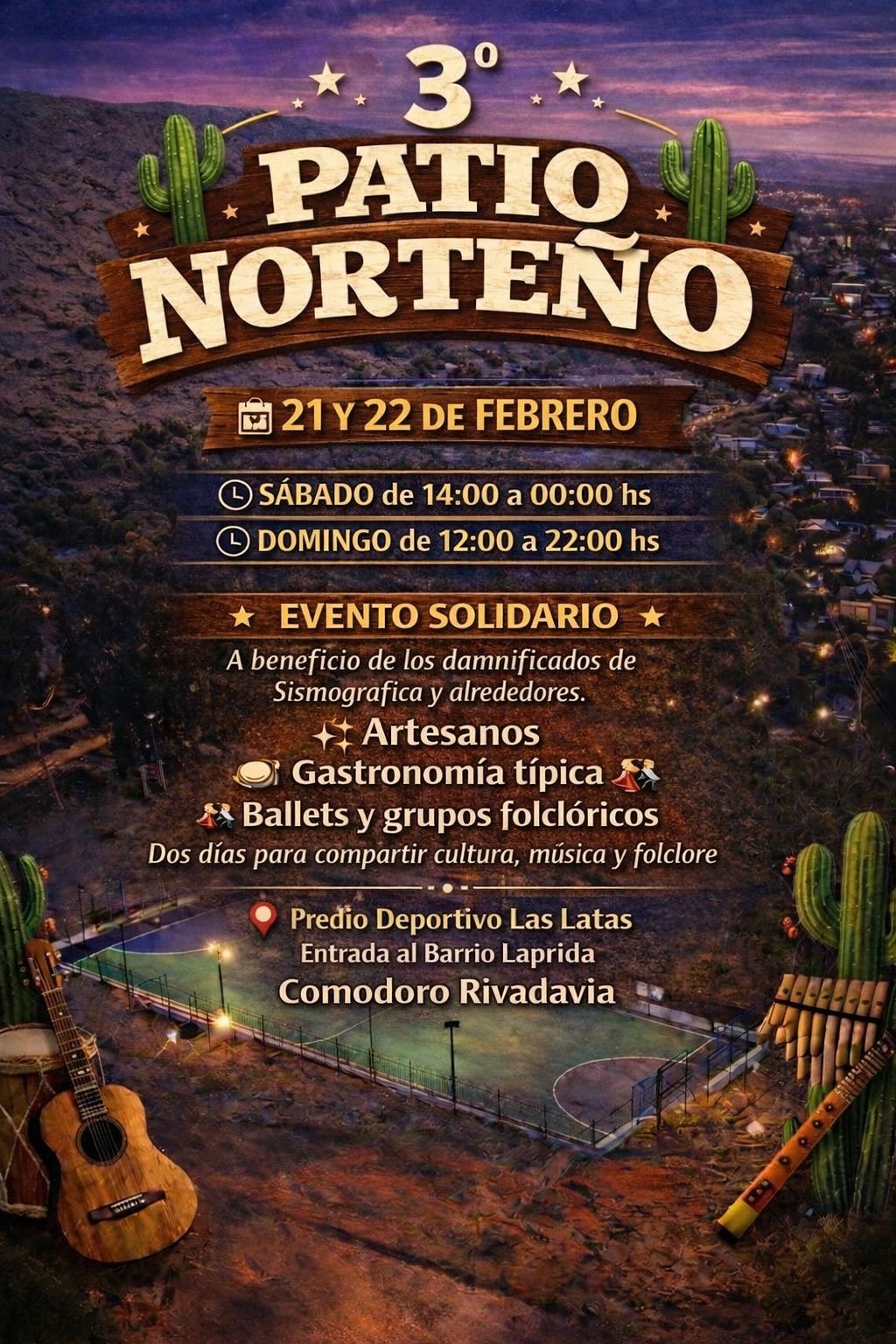 Este fin de semana se realizará el 3° Patio Norteño en el Predio Deportivo Las Latas, en la entrada al barrio Laprida. El evento, de carácter solidario, será a beneficio de los damnificados de Sismográfica y alrededores.