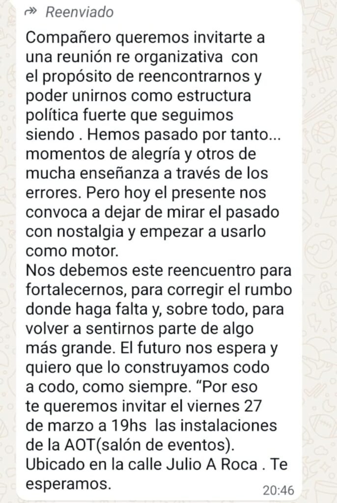 El mensaje, difundido por grupos de WhatsApp, no deja dudas sobre el objetivo: “reencontrarnos”, “corregir el rumbo” y volver a consolidar una estructura política fuerte. No es solo un encuentro, es el intento de volver a ordenar su espacio y recuperar volumen político.