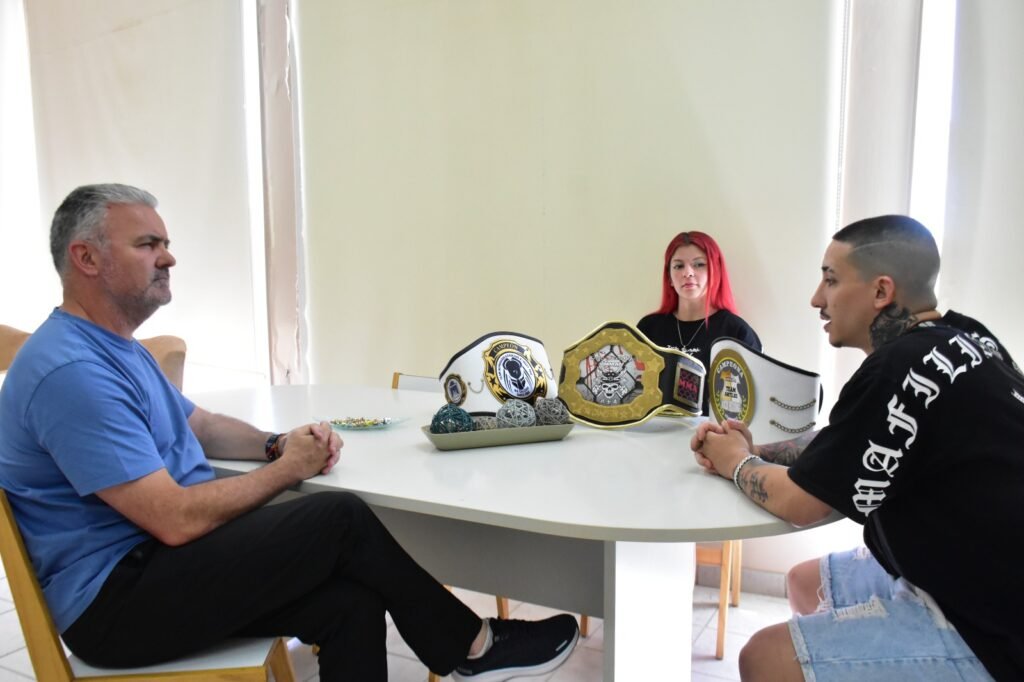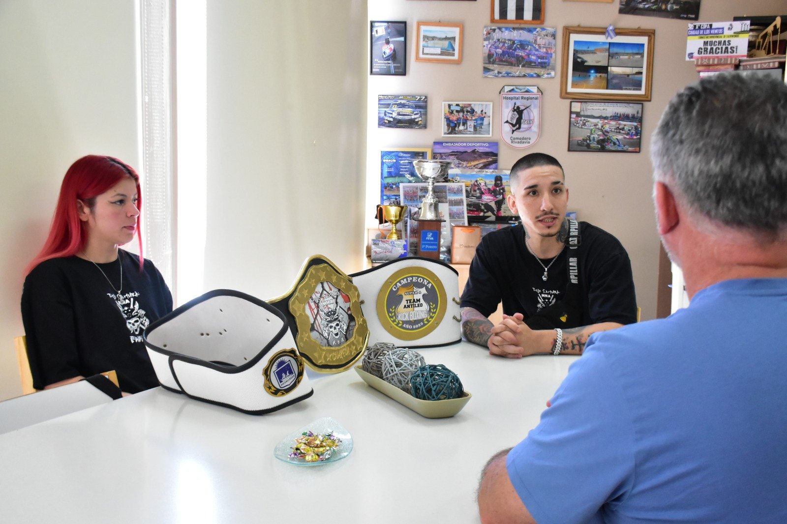 Marlene Balbuena y Axel Hernández (Dojo Samurái) visitaron al presidente de Comodoro Deportes, Hernán Martínez, y dialogaron sobre el importante combate que se aproxima.