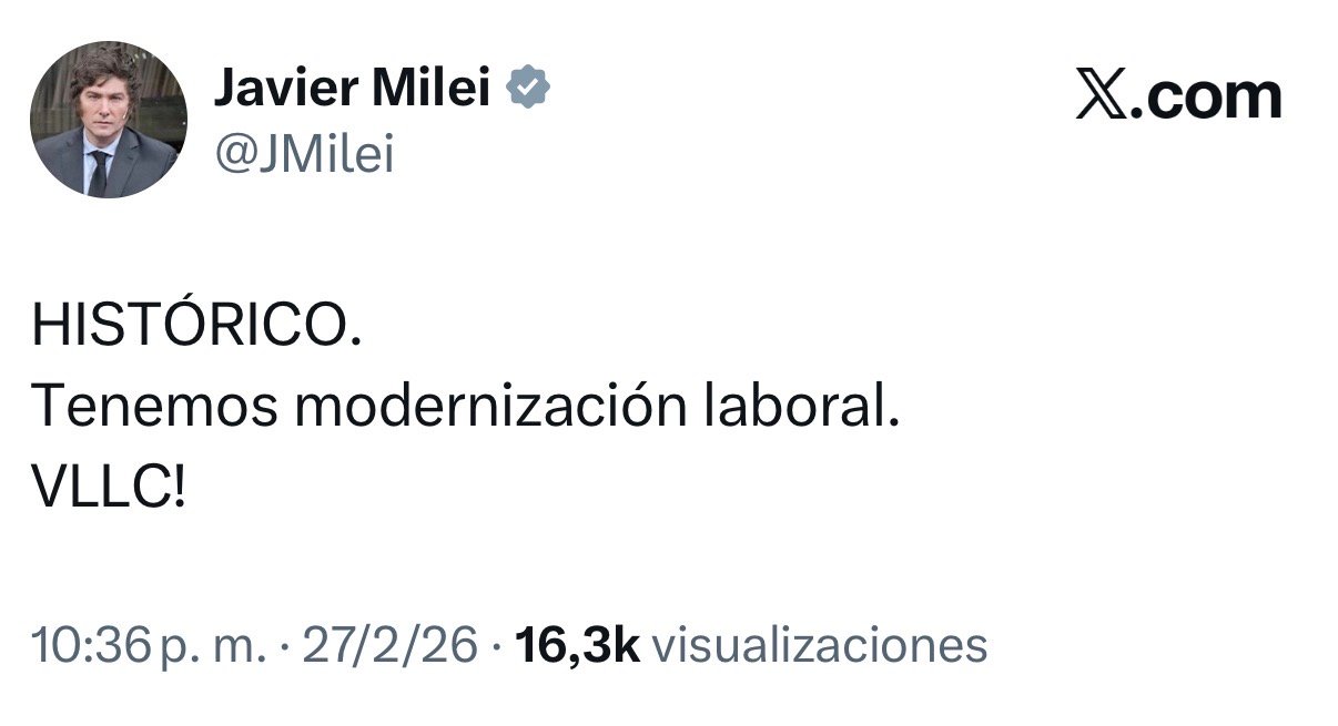 El presidente de la Nación, Javier Milei, celebró en la red social X la aprobación de la reforma laboral en el Senado con un mensaje breve y enfático: “HISTÓRICO. Tenemos modernización laboral. VLLC!”.
