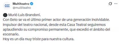 “Hoy es un día muy triste para nuestra cultura”, sostiene el comunicado difundido en redes sociales por la empresa argentina de salas teatrales fundada por Carlos Rottemberg. “Con Beto se va el último primer actor de una generación inolvidable”, agrega.
