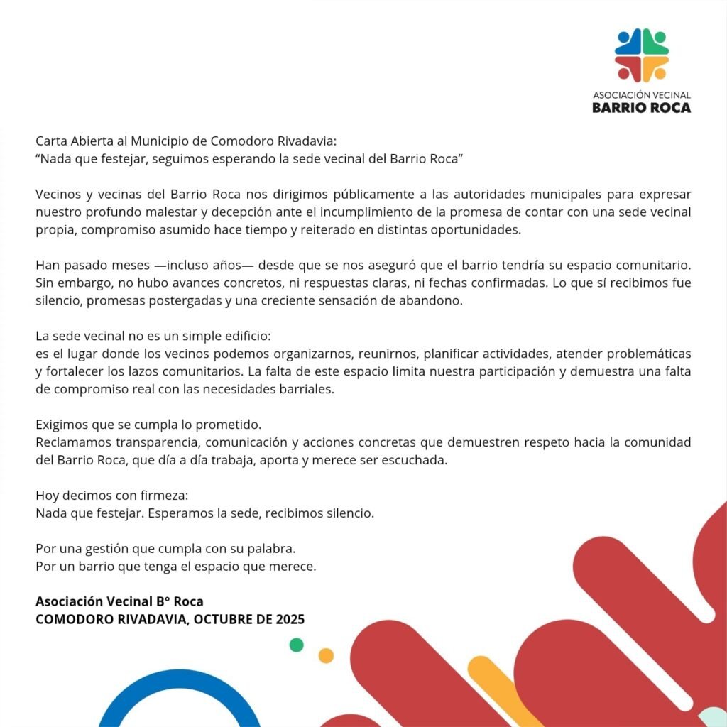 Reclamamos transparencia, comunicación y acciones concretas que demuestren respeto hacia la comunidad del Barrio Roca, que día a día trabaja, aporta y merece ser escuchada.