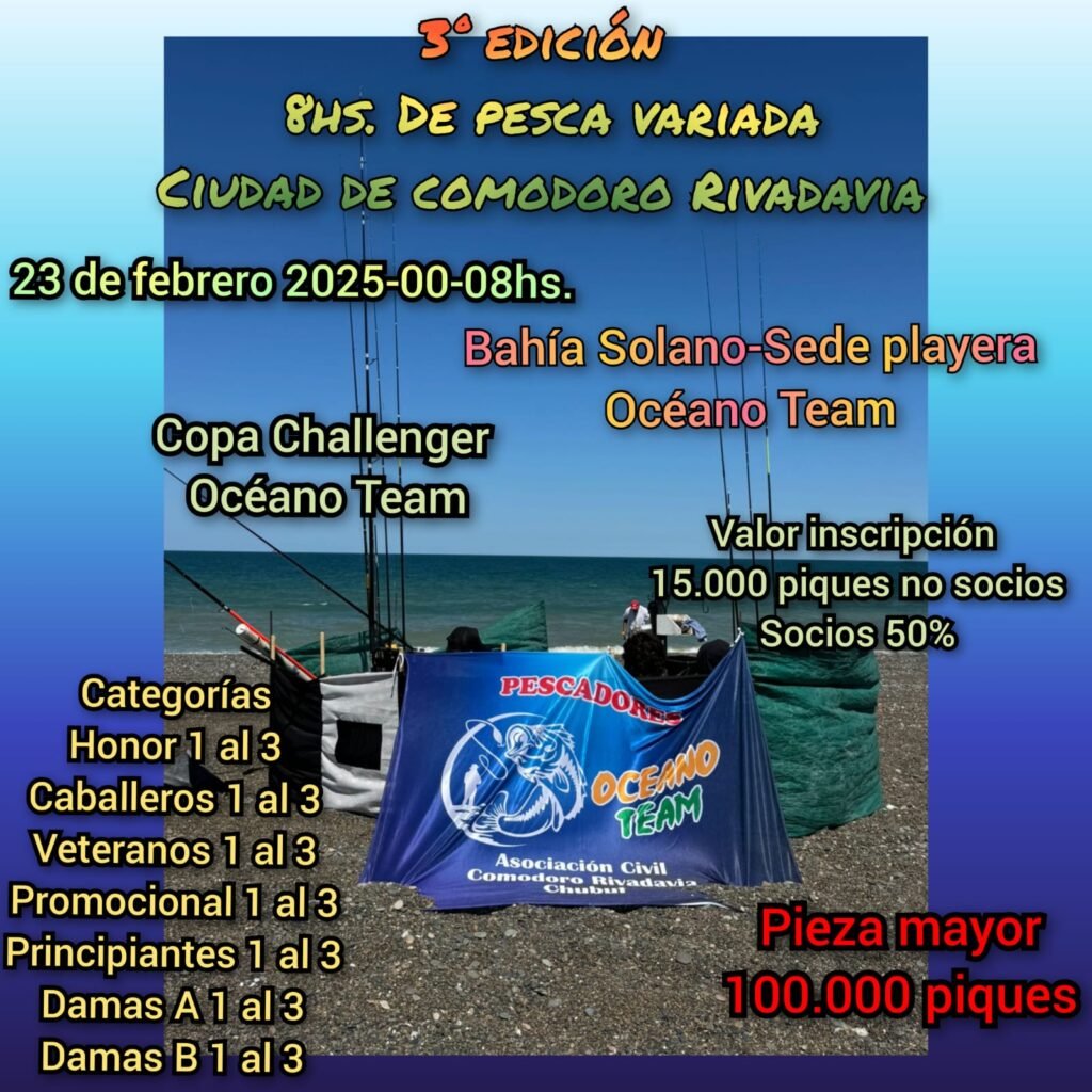 El domingo 23 de febrero, de 0:00 a 08:00 horas, se realizará la 3era edición de las 8 horas de pesca variada, certamen en el cual se pondrá en juego la Copa Challenger. La competencia se disputará en las categorías: Honor, Caballeros, Veteranos, Promocional, Principiantes, y Damas A y B.