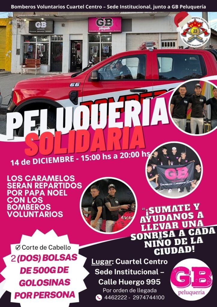 Es un evento de «PELUQUERIA SOLIDARIA» organizado por Bomberos Voluntarios junto a GB Peluquería y todo lo recaudado será para repartir en navidad por los barrios de la ciudad.