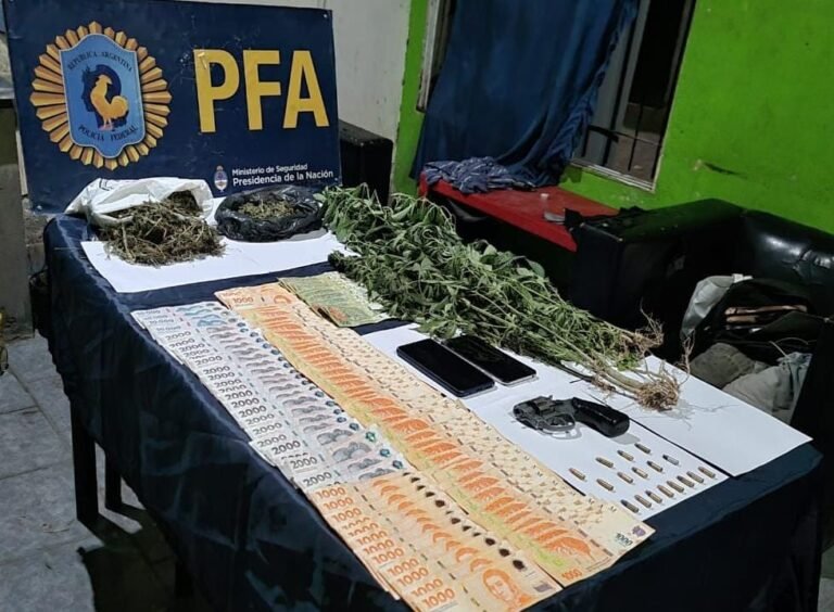 Con las evidencias puestas a disposición de los magistrados, se dispuso la realización de un allanamiento sobre ese domicilio, donde se concretó la aprehensión de un ciudadano argentino, al tiempo que se lograron incautar 60 gramos de cogollos, 150 gramos de hojas y 7 plantas de marihuana, junto con un revólver calibre 22 con varias municiones, 2 celulares y la suma de 160 mil pesos en billetes de baja denominación, entre otros elementos de interés.