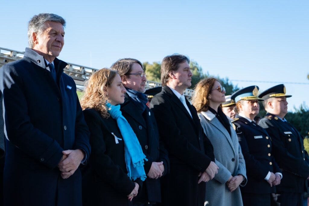 La ceremonia comenzó con el izamiento del pabellón nacional, encabezado por la intendente Mariel Peralta, acompañada por la comisario Roxana Correa, jefa de la División Unidad Operativa Federal de Comodoro Rivadavia, y el comisario Raúl Jones de la Unidad Regional.