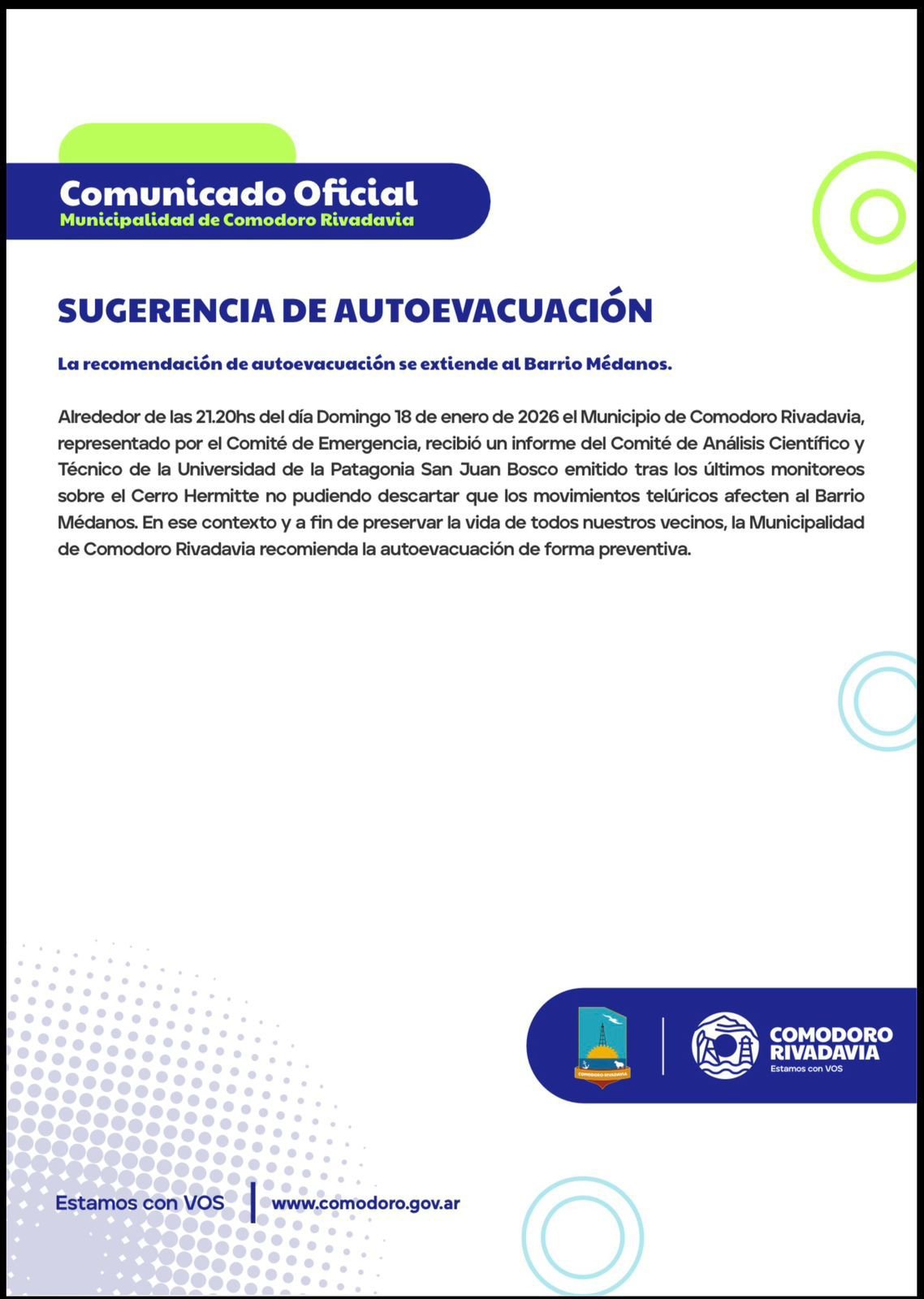La Municipalidad de Comodoro Rivadavia emitió un comunicado oficial donde se recomienda la autoevacuación preventiva de los vecinos del Barrio Médanos debido a la posibilidad de movimientos telúricos en el Cerro Hermitte que podrían afectar el área.