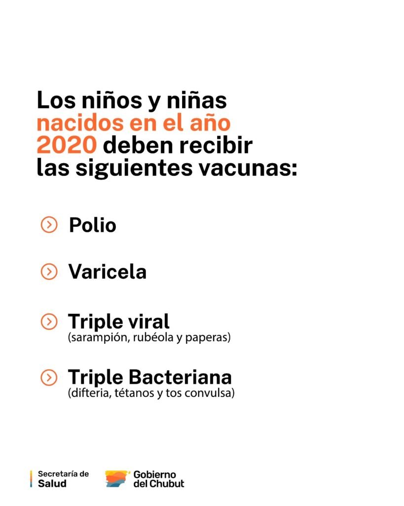 Por otro lado, desde la cartera sanitaria provincial recordaron que las vacunas que deben recibir los niños nacidos en 2020 son las siguientes: la vacuna Triple Viral, que previene el Sarampión, la Rubéola y las Paperas; la vacuna Triple Bacteriana Celular, que previene la Difteria, el Tétanos y la Tos Convulsa; el refuerzo de la vacuna Salk, que previene la Poliomielitis; y la segunda dosis de la vacuna contra la Varicela.