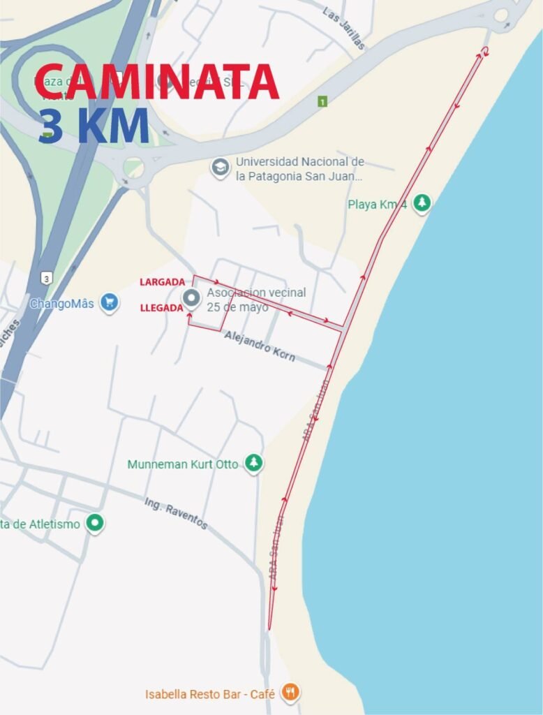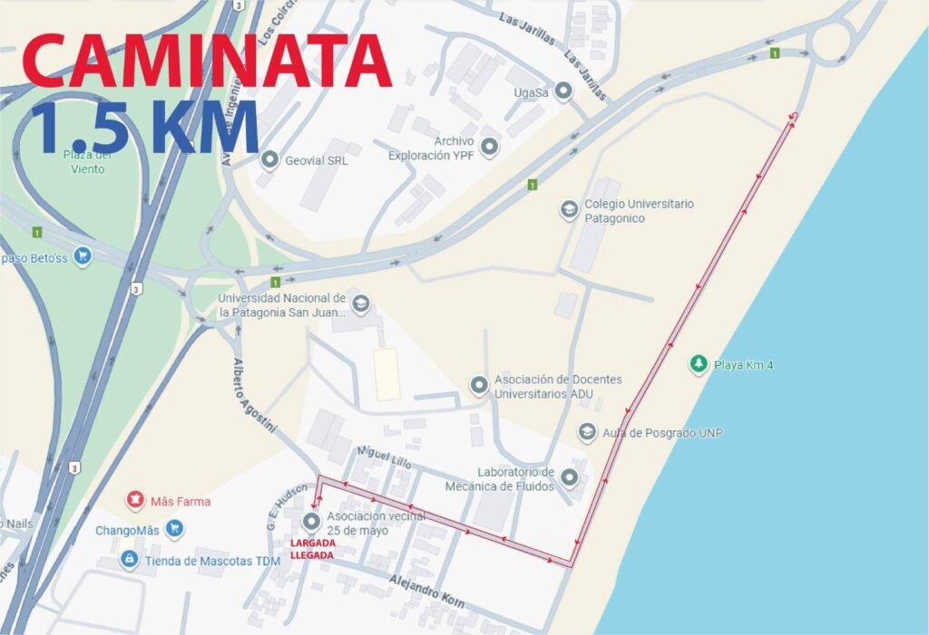 El punto de concentración será la Asociación Vecinal del barrio 25 de Mayo (Km. 4), ubicada en la calle Enrique Mosconi Nº96. Serán dos distancias: 1 kilómetro y 3 kilómetros, y los caminantes recorrerán gran parte del Paseo ARA San Juan.