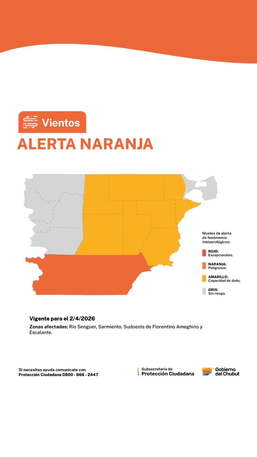 De acuerdo al informe oficial, en las regiones alcanzadas por el nivel naranja se prevén vientos del sector oeste con velocidades sostenidas de entre 45 y 65 km/h, acompañados por ráfagas muy intensas que podrían superar los 120 km/h durante la noche. En esas mismas áreas, durante la mañana y la tarde regirá un alerta de nivel amarillo.