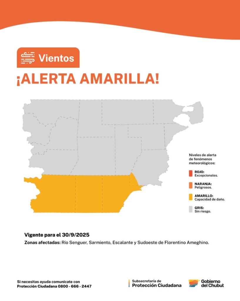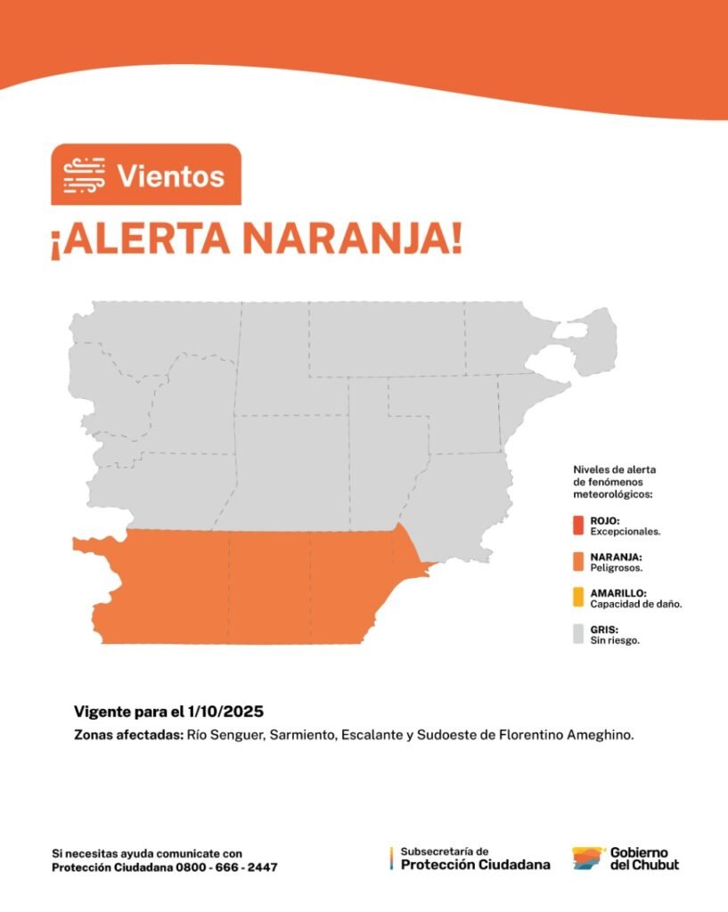 29 de septiembre de 202529 de septiembre de 2025 Septiembre se despide con alerta amarilla por viento y octubre comienza con alerta naranja Sociedad Así lo anunció el Servicio Meteorológico Nacional donde indicó que el sur de Chubut tendrá ráfagas de viento que superarían los 90 km/h este martes y miércoles.