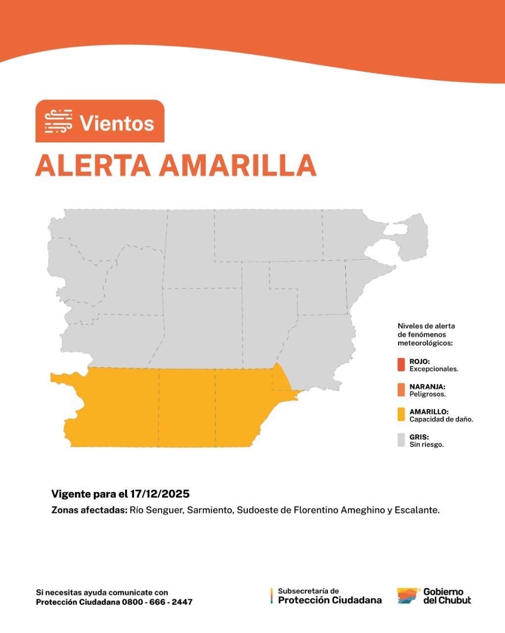 La Subsecretaría de Protección Ciudadana informa que se ha emitido un alerta amarilla por vientos fuertes para la mañana y mediodía del miércoles 17 de diciembre en la zona. Las ráfagas podrían superar los 90 km/h.