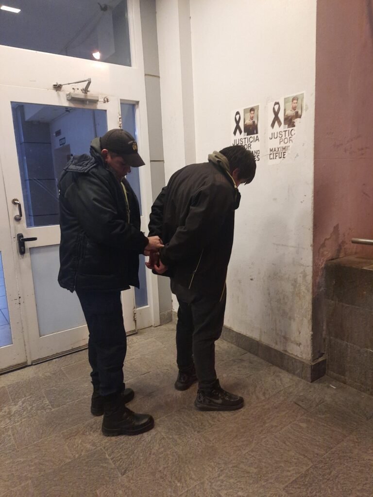 Rapidamente llegó policía de la comisaria primera y constatan la presencia de Manquicheo quien fue detenido por el ddelito en flagrancia de Desobediencia Judicial y fue trasladado a la comisaría donde aguarda la audiencia de control de detención.