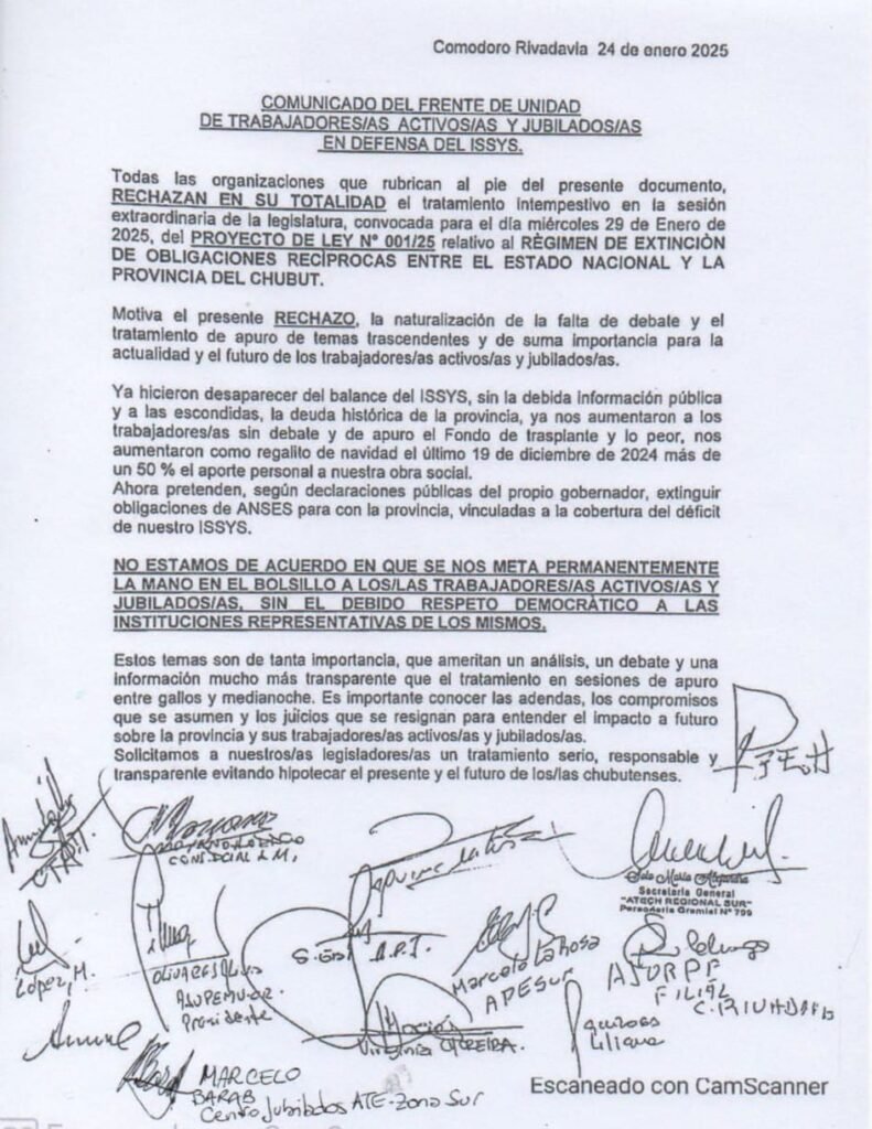 “Solicitamos a nuestros legisladores/as un tratamiento serio, responsable y transparente evitando hipotecar el presente y el futuro de los chubutenses” concluyeron.