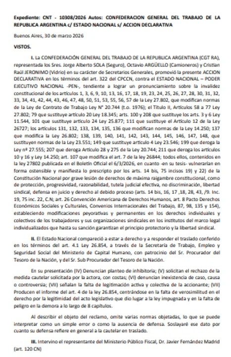 En la cautelar, se asegura que la CGT “posee legitimación activa para impugnar los artículos señalados”, vinculados a los “derechos de sindicalización, negociación colectiva y huelga”, teniendo en cuenta, también, los aspectos “individuales comunes y homogéneos” de los grupos de trabajadores, “cuya prestación se encuentra regulada» por las normas vigentes en nuestro país.
