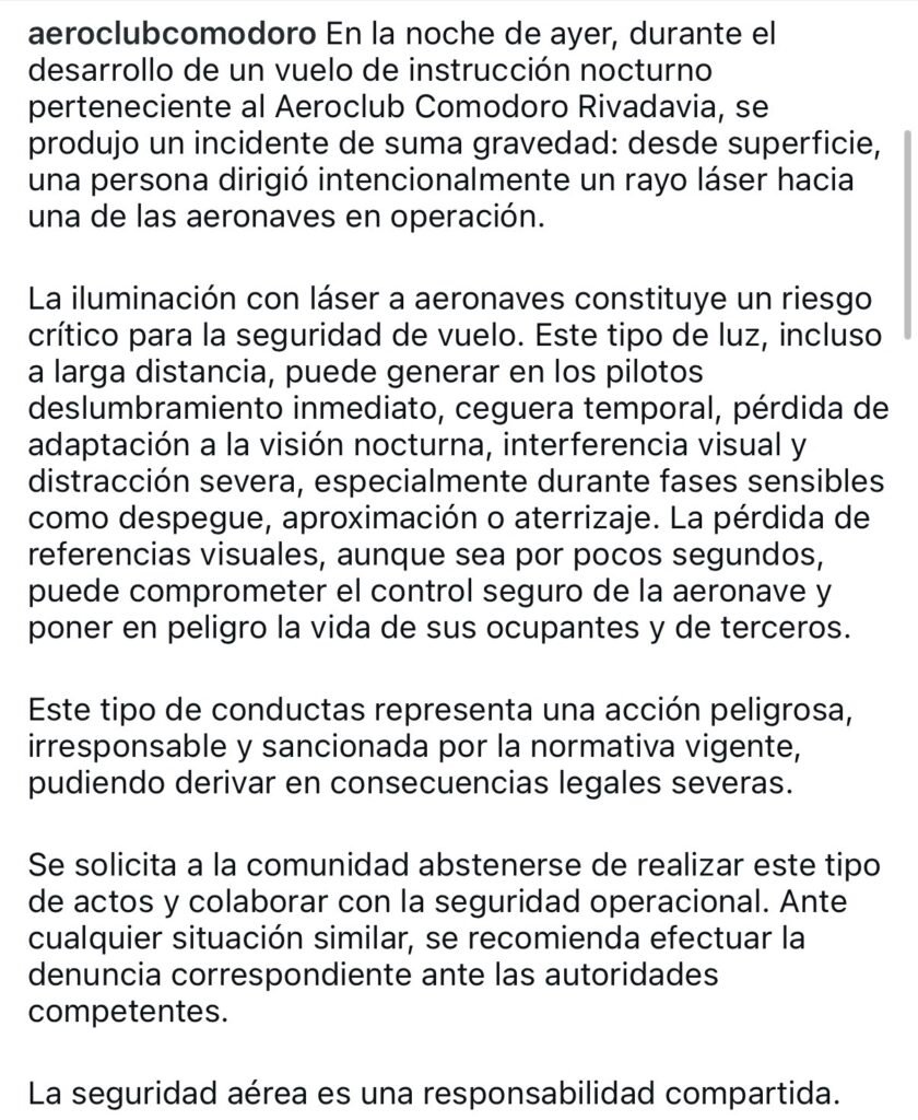 El Aeroclub Comodoro Rivadavia informó que en la noche del sábado una de sus aeronaves fue blanco de un rayo láser mientras desarrollaba un vuelo de instrucción en horario nocturno. Según detallaron, desde tierra una persona habría dirigido intencionalmente el haz de luz hacia el avión en plena operación.