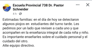 En la jornada del viernes la Dirección de la Escuela Provincial N°738 » Dr. Pastor Schneider» ubicada en el barrio San Cayetano emitió un comunicado a través de redes sociales dando aviso de presencia de «visitantes» en la institución.