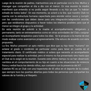 Agregó que, a pesar de presentar el certificado de discapacidad al momento de inscribir a Nicolás en el club, ahora se le acusa de haber ocultado esta información. «Desde el principio dejamos claro que Nicolás tiene autismo, así que es absurdo que ahora digan que lo ocultamos», enfatizó.