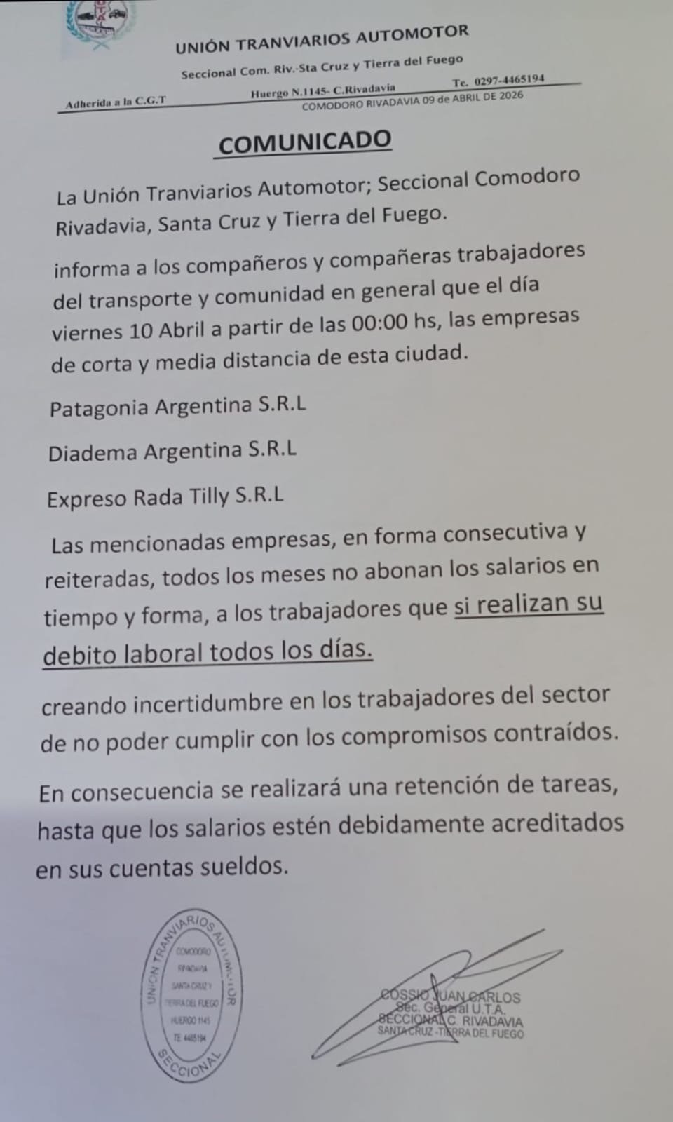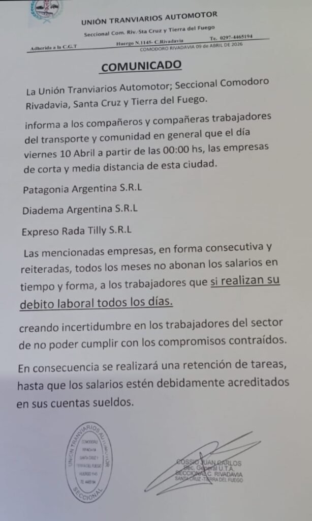 La medida afecta a las empresas Patagonia Argentina S.R.L., Diadema Argentina S.R.L. y Expreso Rada Tilly S.R.L., las cuales —según el comunicado sindical— adeudan salarios de manera reiterada y no cumplen con los pagos en tiempo y forma.
