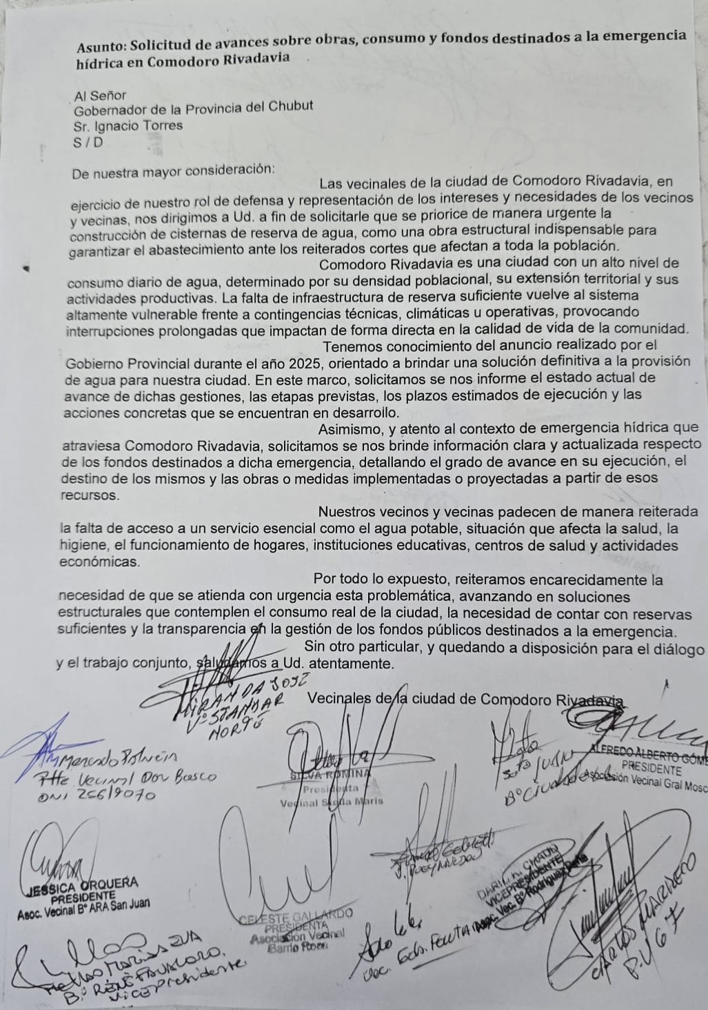 La nota formal fue entregada el mismo día al secretario de Vinculación Ciudadana, Guillermo Almirón, y enviada posteriormente al gobernador Ignacio Torres. Actualmente, las vecinales se encuentran a la espera de una respuesta oficial.