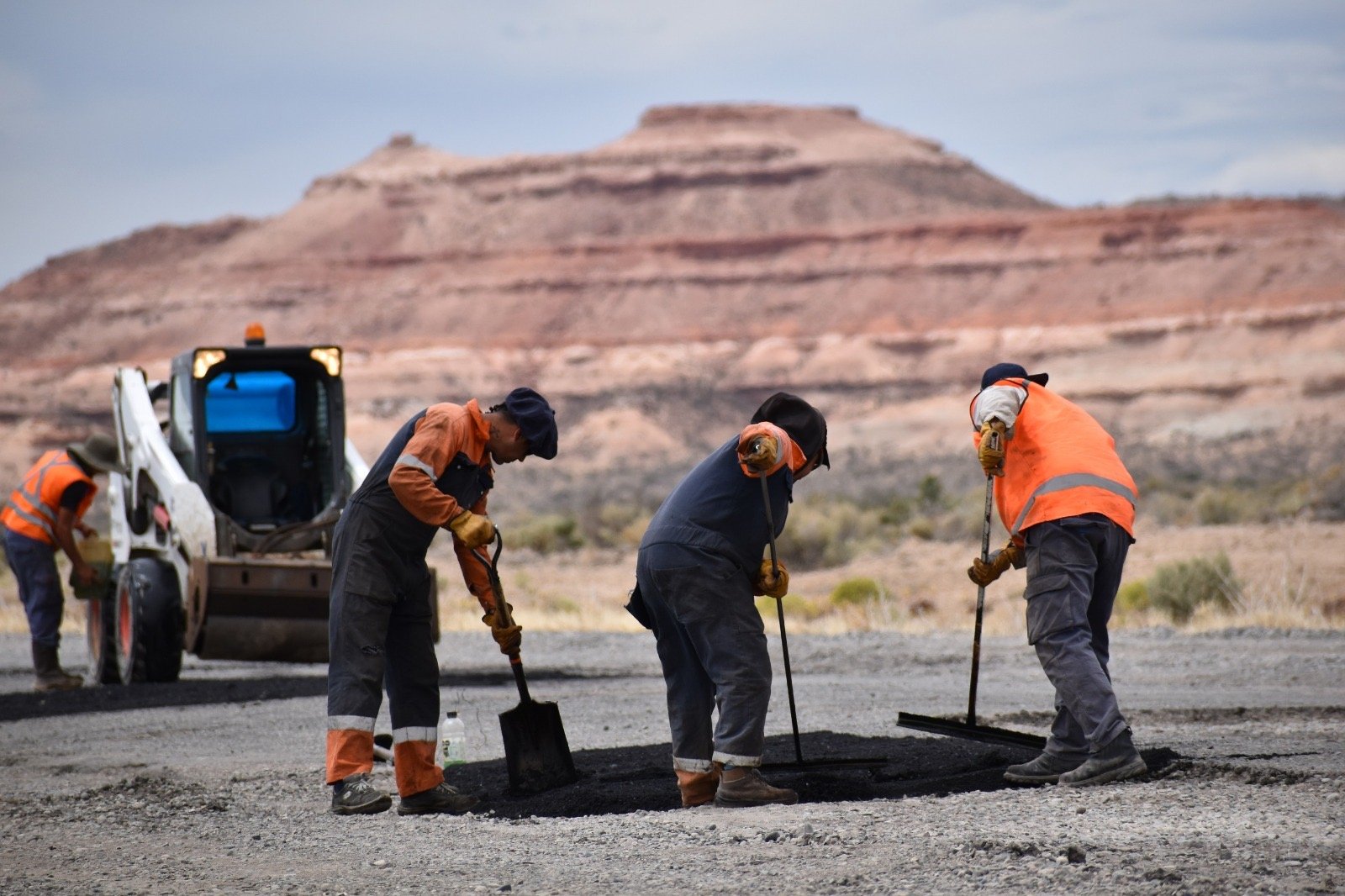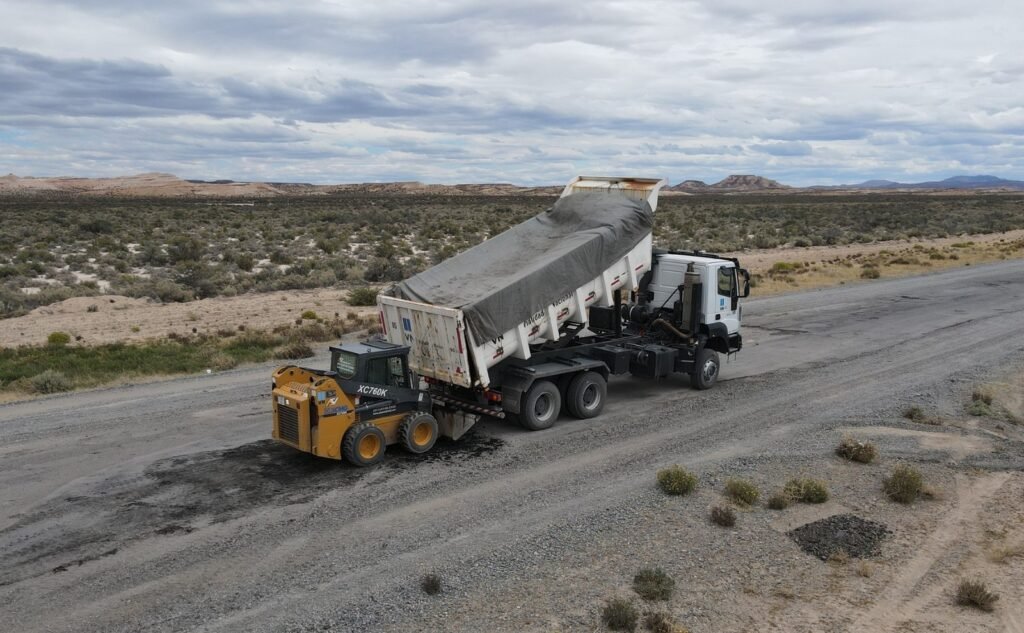 Las tareas, que se llevan a cabo con material asfáltico caliente elaborado en la propia Planta de asfalto de Vialidad Nacional ubicada en el campamento de Tecka, se desarrollan en diferentes sectores.
