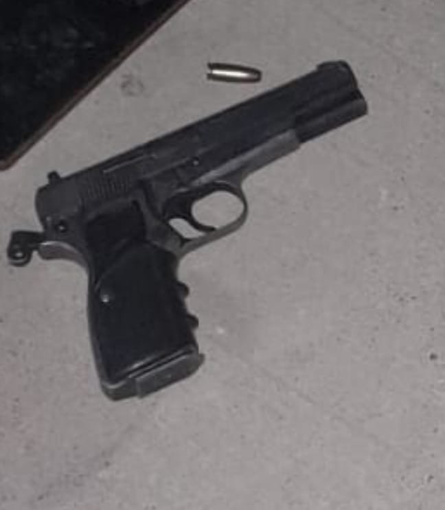 Durante la persecución, el individuo arrojó al suelo una riñonera y un morral, que contenían un arma de fuego tipo pistola con numeración erradicada, un cargador, una munición de 9mm y un teléfono celular.